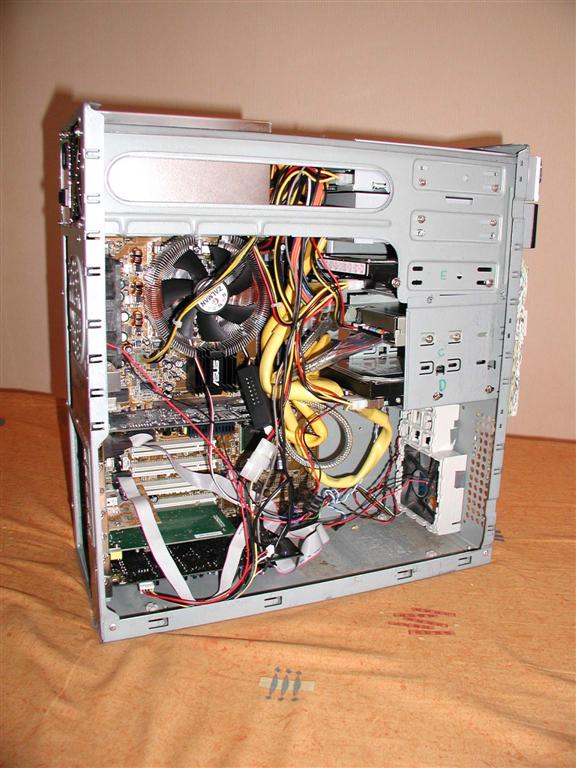 | Les nappes rondes, c'est encore assez touffu, mais ce n'est rien par rapport aux nappes plates. Le boîtier de commande du ventilateur de CPU est coincé dans une des boucles. |
