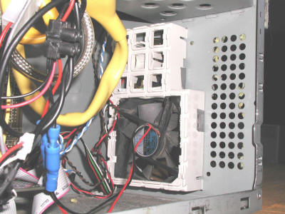 | Un ventilateur 80 mm alimenté en 5V au lieu de 12V sur l'avant de la tour, injectant l'air frais dans celle-ci. La grille à droite aussi est fonctionnelle, car il y a trois ventilateurs qu'il faut alimenter en air à l'arrière .