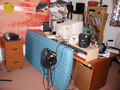 | Voici le boîtier installé à sa place, sous un solide tréteau en hêtre. A droite, une épaisse planche doublée d'isolant phonique atténue encore le bruit résiduel de sortie des ventilateurs. |